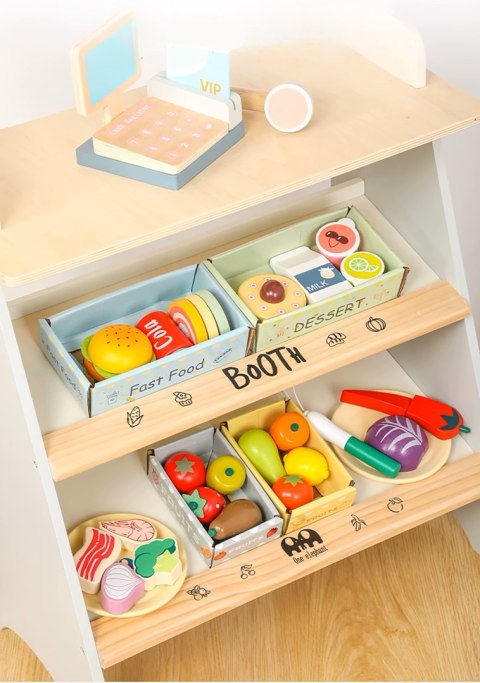 Czy Twoje dziecko marzy o wcieleniu się w rolę kierownika sklepu? Nasz nowy drewniany sklep to idealne miejsce do kreatywnej zabawy! Pięknie pomalowany na żywe kolory, wyposażony w sklepowe półki, ladę oraz stragan na warzywa i owoce, zapewnia niezapomniane chwile radości.