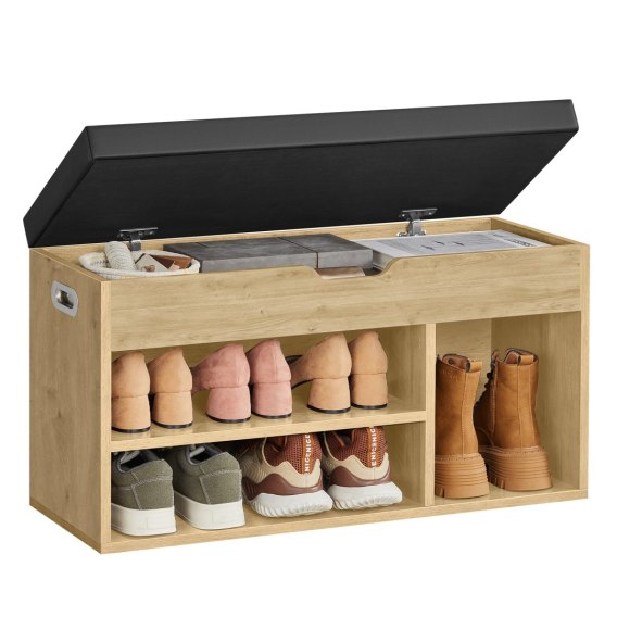 Korpus wykonano z płyty wiórowej w dekorze dąb artisan, który nadaje wnętrzu ciepły, naturalny charakter. Całość uzupełnia miękkie siedzisko w kolorze czarnym, pokryte trwałą skórą typu PU, zapewniającą wygodę podczas zakładania obuwia oraz łatwość w utrzymaniu czystości.